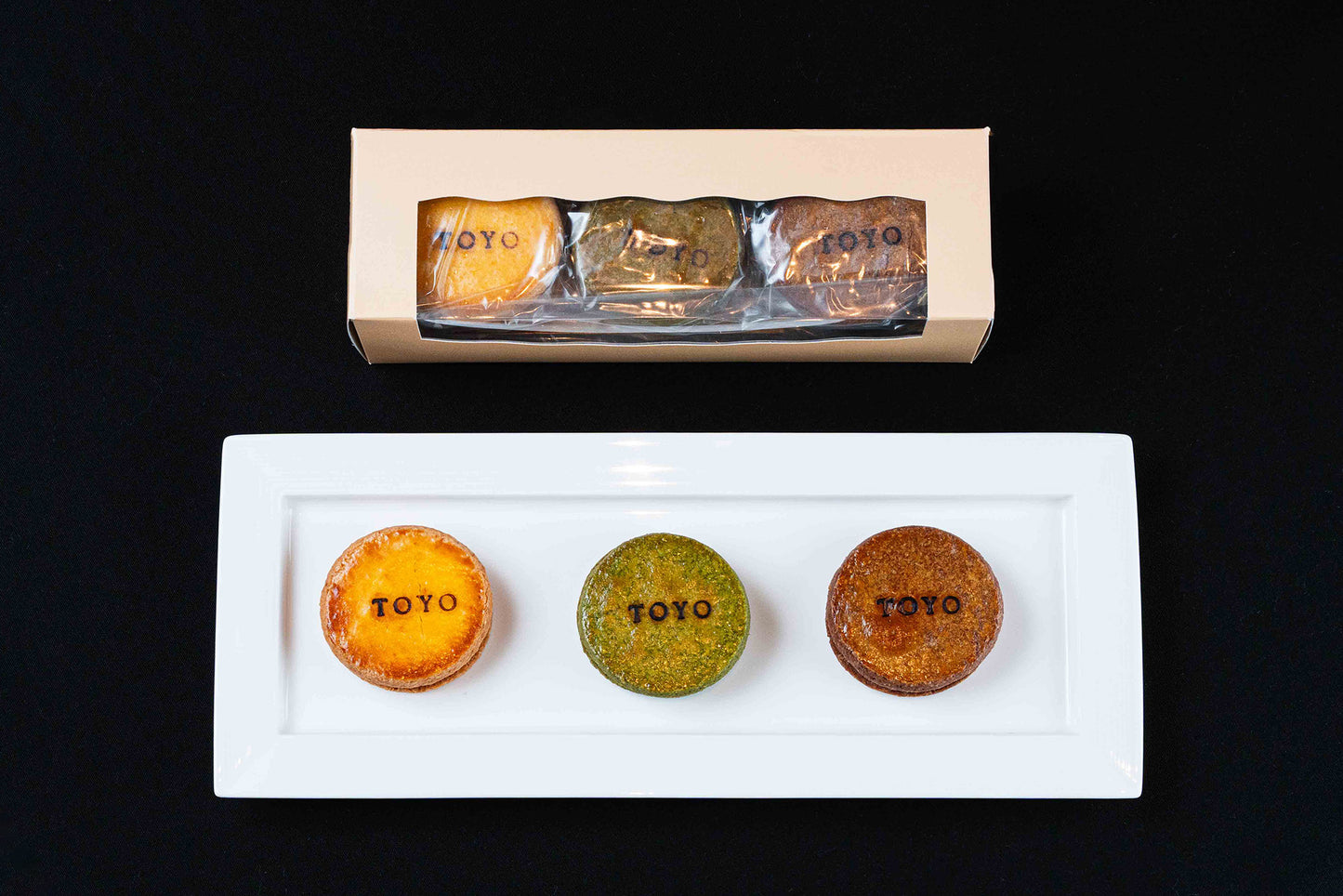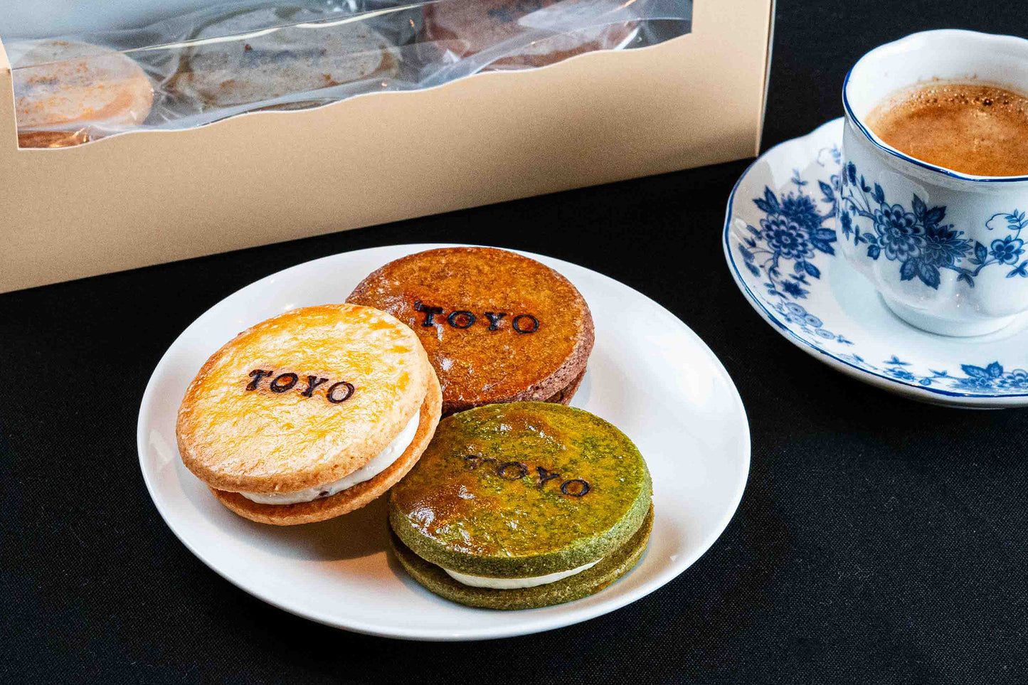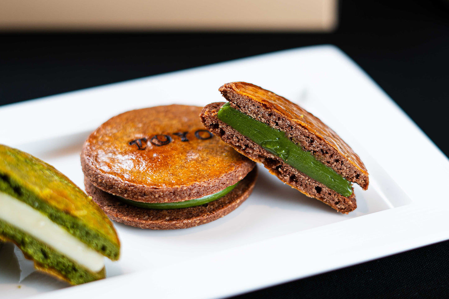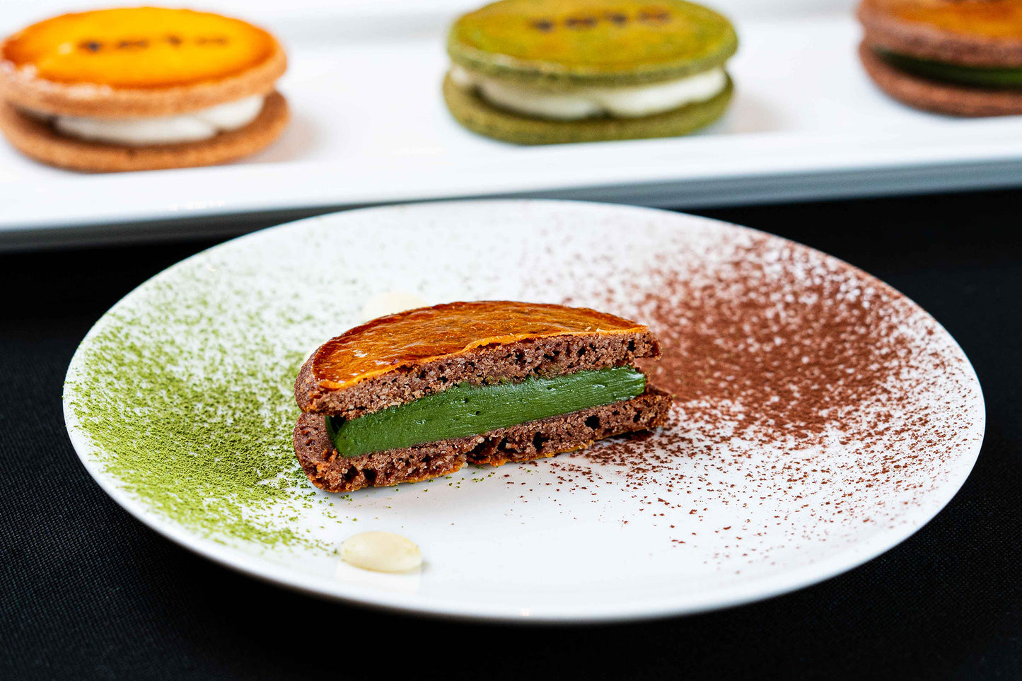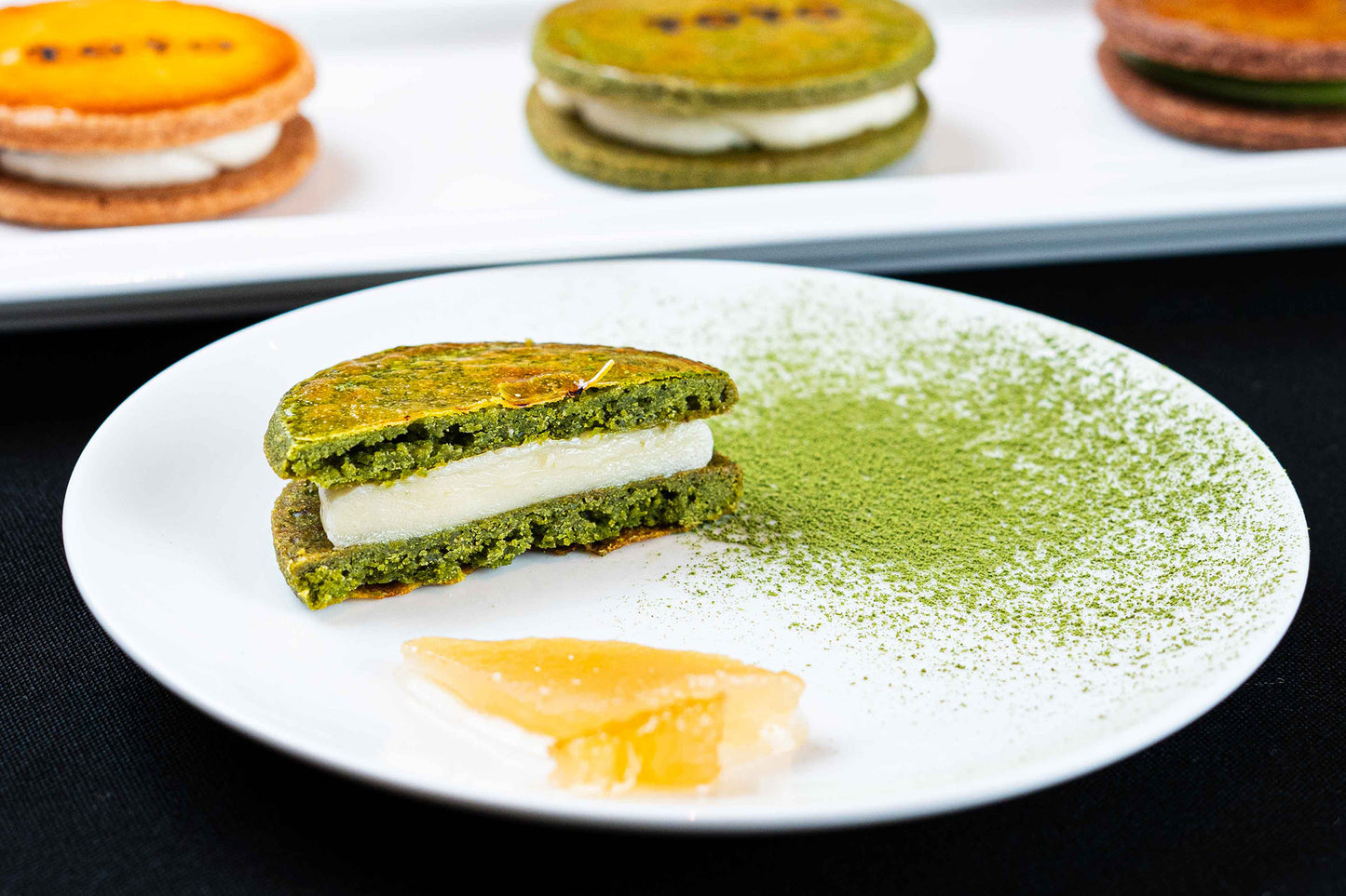 自家製の晩白柚ピールを加えたバタークリームを、八女茶サブレでサンド。
