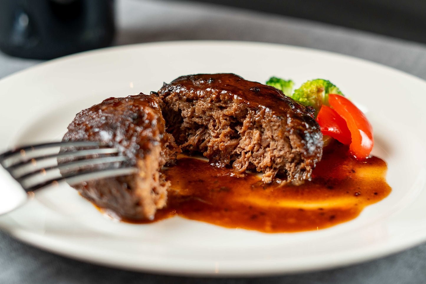 食育プロジェクトの一環として一頭買いした黒毛和牛「ふくちゃん」を贅沢に使用し、肉の旨みを存分に引き出した、肉肉しさあふれるハンバーグを作りました。